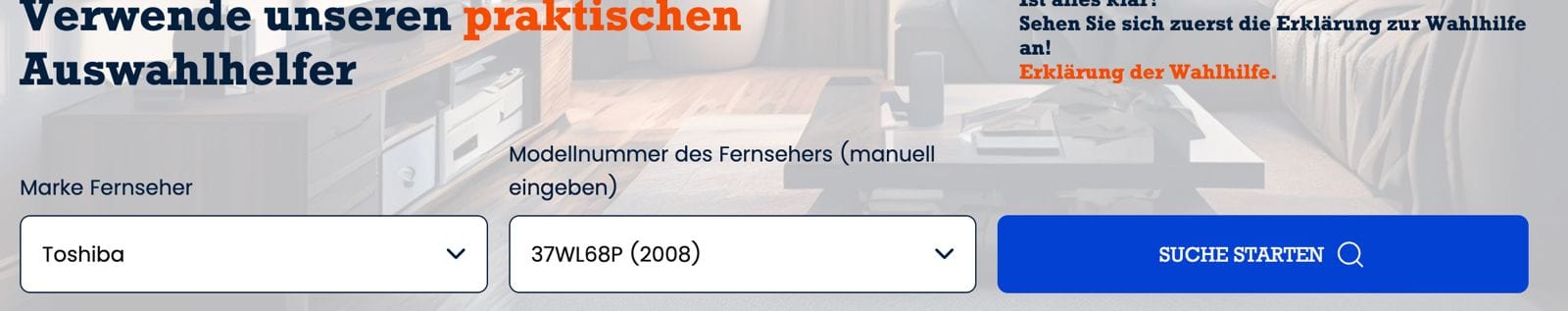 Wandhalterungshop.de verfügt über eine sehr praktische Auswahlhilfe für Wandhalterungen, in der Sie die Marke und den Typ des Fernsehers auswählen und eine Übersicht über die verfügbaren Wandhalterungen für Ihren Fernseher erhalten.