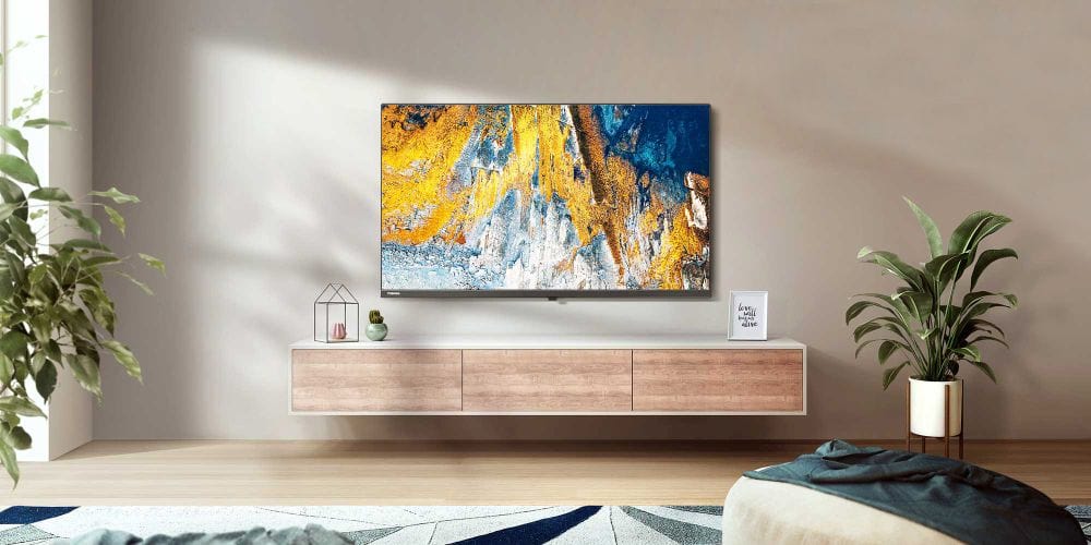 Im beigefügten Beispiel ist der Toshiba-Fernseher im Wohnzimmer an einer universellen Wandhalterung aufgehängt.